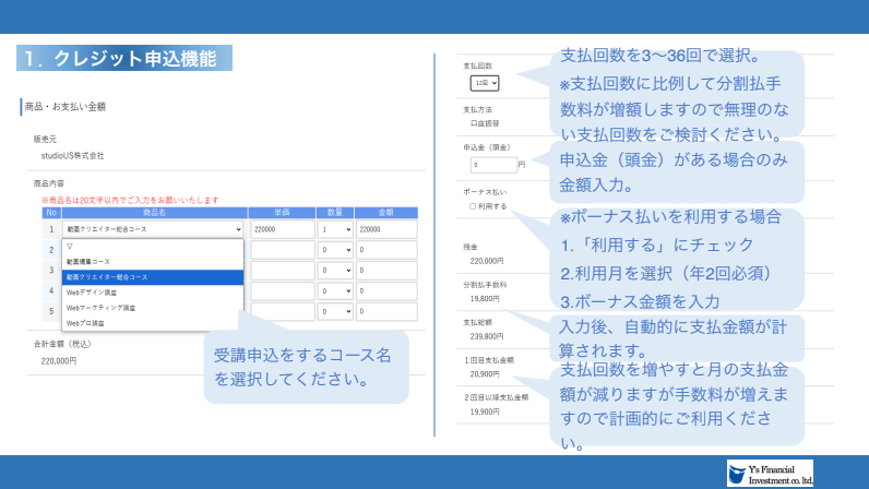 分割払いは「ワイズクレジット(ショッピングクレジット)」にてお手続きをお願いいたします。 お支払いは最大21回までの分割回数からお選びいただけます。